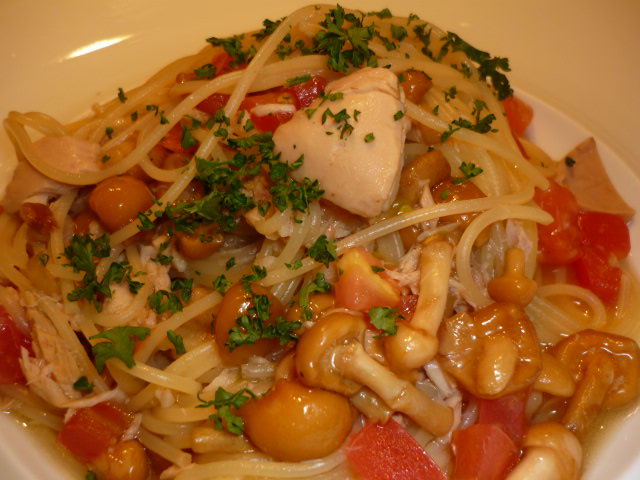 今回のパスタは、シーチキンとキノコのパスタ。