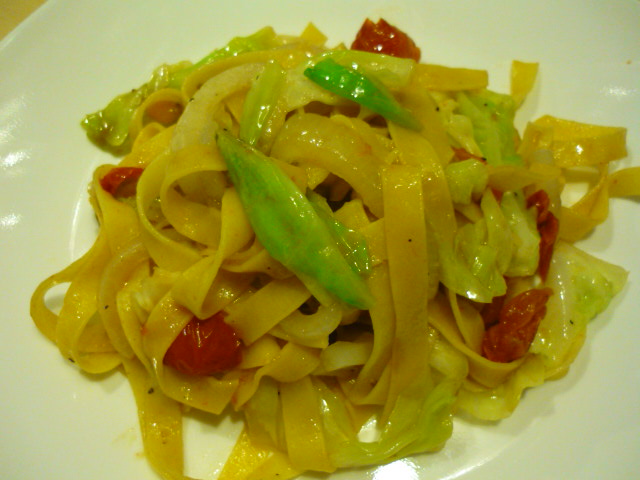 でも、あっさりと食べたかったので、ガーリックオイルでプチトマトと春キャベツ&アンチョビを炒めて。