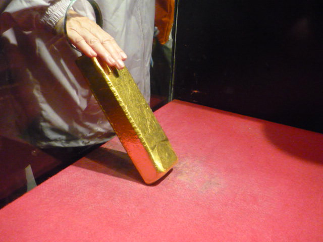 写真の金の延べ棒は12・5kgの重さ。